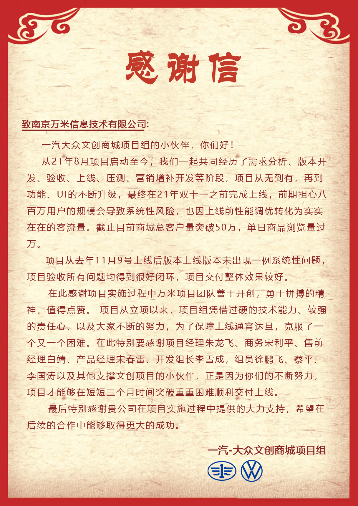 項目的成功上線,得益于雙方的緊密配合,一汽大眾的理解、支持和配合,為萬米鋪就了坦途大道,讓項目組成員沒有后顧之憂,只管向前。在往后的合作中,萬米會帶著誠懇的態(tài)度,為彼此更大的成功而繼續(xù)努力。