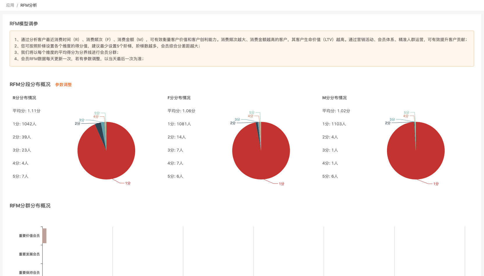 平臺已提供RFM會員分析模型,通過分析客戶最近消費時間(R)、消費頻次(F)、消費金額(M),可有效衡量客戶價值和客戶創(chuàng)利能力;通過營銷活動、會員體系、精準人群運營,可有效提升客戶貢獻。系統(tǒng)提供會員標簽、會員分群、會員分群運營計劃和消息觸達模塊可實現(xiàn)精準營銷。