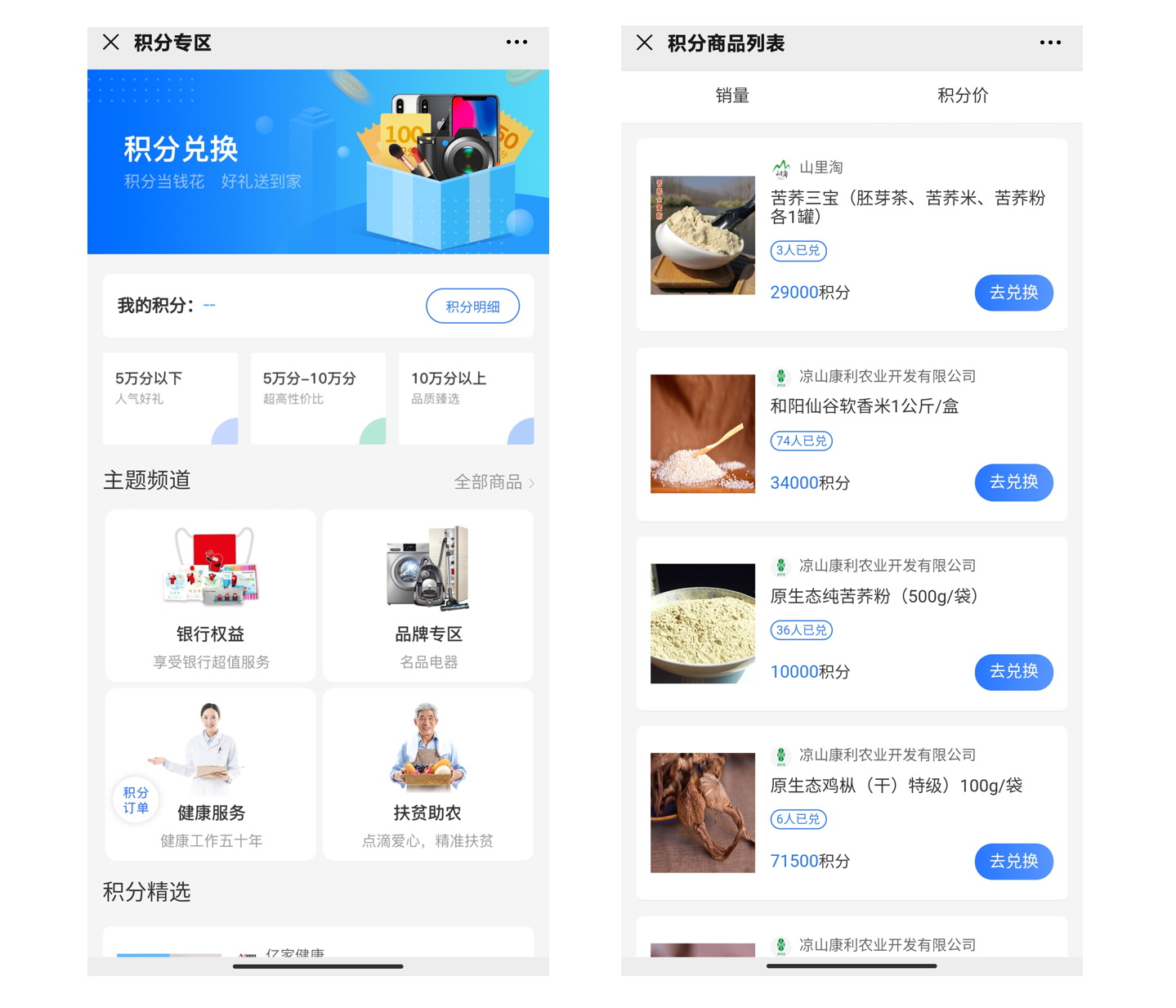 平臺包含積分商城模塊,結合銀行權益、品牌商品、健康服務、扶貧助農(nóng)等為會員提供積分兌換服務,促進積分消耗,增加會員粘度的同時,促進銀行主營業(yè)務發(fā)展。