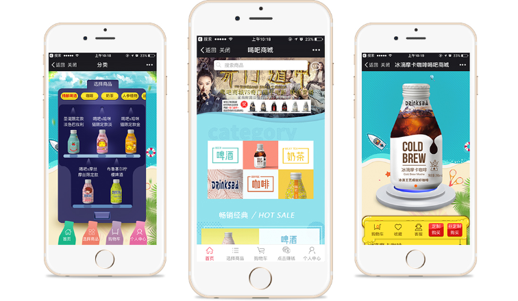 萬米助力嘉美打造的喝吧定制商城,分為PC端線上商城和微信H5商城。喝吧PC端商城主要用于多款精釀啤酒、咖啡奶茶等公司主打定制產品的推廣和零售。這些商品不僅“品質好”,而且“顏值高”。其獨特的定制罐、絢麗的包裝殼可滿足廣大消費者多樣化的定制需求。整個網頁前端呈現的畫面清新美觀,操作簡單卻不單調,可以“玩轉一罐”、也可以“推廣賺錢”。